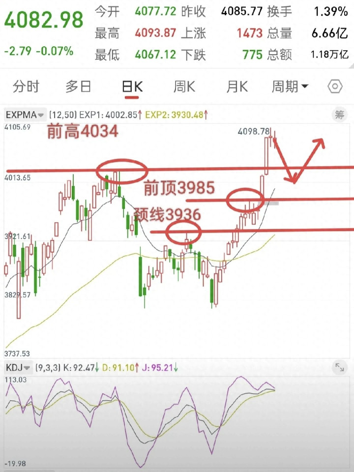 但是,老股民都懂,临近周末,资金多少会有点恐高情绪,不想拿过周末。所以,冲高之后,会有获利盘兑现,指数可能会回落一点,最终大概率会在4090点附近稳住收盘。